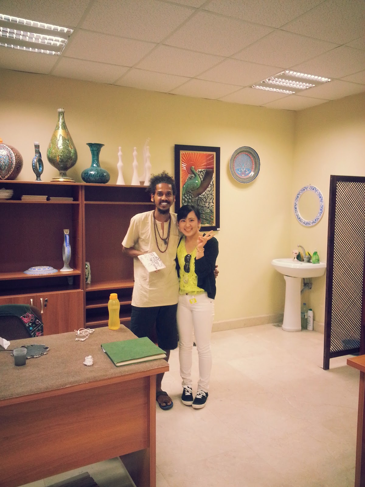 I was just taken aback by this entire explanation, but i just let it pass. After all this explanation the tourists take a walk around in the studio looking at the artists do the paintings on the ceramics. Group after group kept coming and going and i noticed how some of them were found of my work since it was very different from the traditional style, no colours only strong black lines and figures not so easy to understand. I just smiled back at them said hello and continued painting. After 4 hours of painting , there arrived one more japanese group. There was this teenaged girl, who did not give a damn about what the guide was explaining , she just stood in front of my table looking with an awe as to what i was making. after few minutes the guide asked the group to move to the next space, they all left including this girl. After 5 mins though this girl returned with her mother and started saying something in japanese to me , to which my response was smile. Then they went and got the guide to translate, so the deal was they girl wanted to buy my work. I was extremely happy and surprised. But i said its incomplete and not cooked, she said its ok and all of a sudden out of the blue the guide just snatched the piece out of my hand and gave it to her. After this he said "photo, photo !!" and i posed with the girl , took a photo. Then he said signature , put your signature. Also which i did not very happily. The girl asked me to write her name, "Moeka". After few minutes the girl her mother the guide and my first ever ceramic art was gone pufff!!